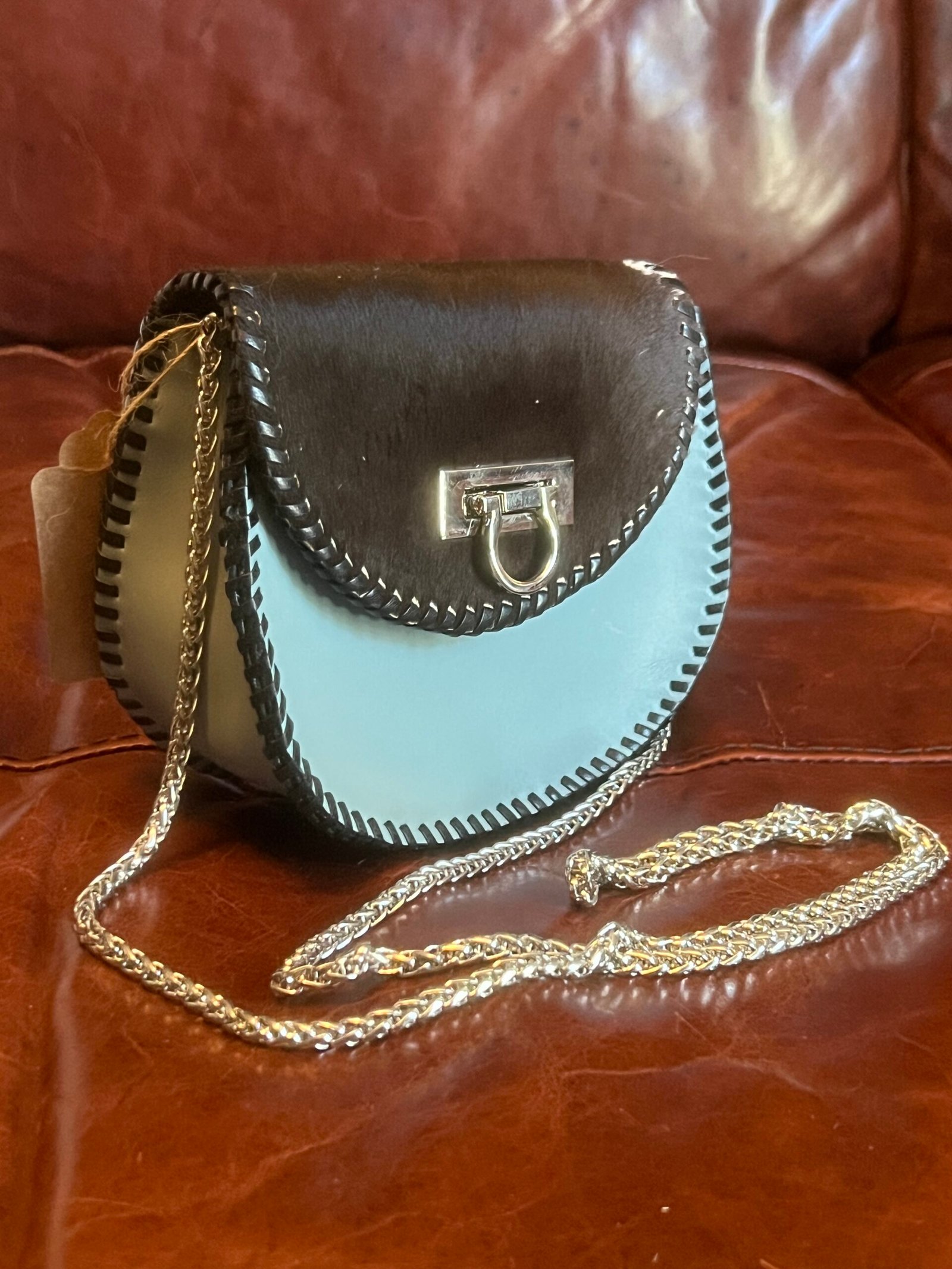 Dark brown and white cowhide, dusty blue leather with silver hardware and matching crossbody chain. This bag features a navy blue lining with a 2 slot built in card holder. Wear as a crossbody, or slip the back belt loop on your favorite belt to make it into a chic fanny pack!