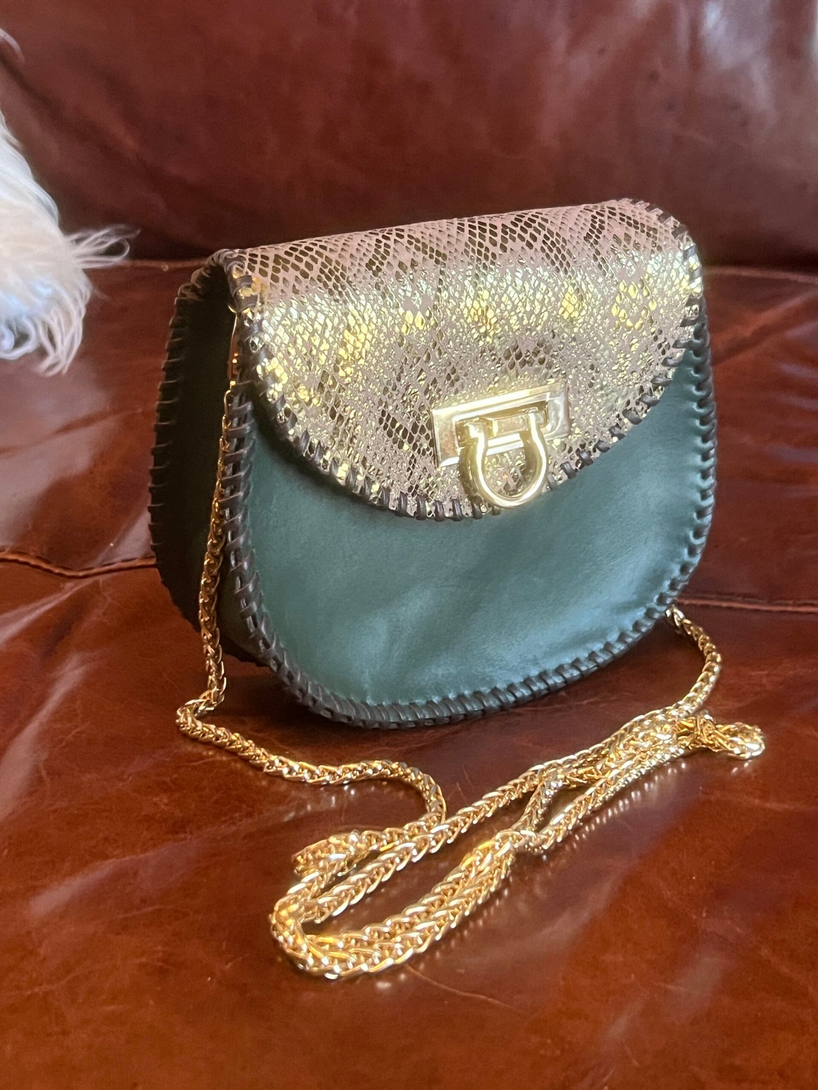Gold embossed snake skin, Forest green leather with gold hardware and matching crossbody chain. This bag features a maroon lining with a 2 slot built in card holder. Wear as a crossbody, or slip the back belt loop on your favorite belt to make it into a chic fanny pack!